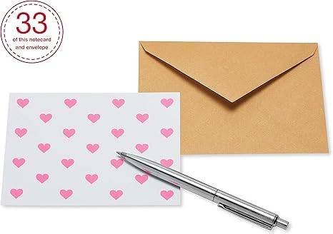 The pack includes 200 single-panel blank note cards featuring pink heart prints, solid colors and coordinating envelopes.