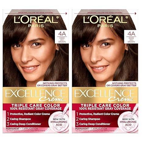 L’Oréal Paris Excellence Crème Permanent Hair Dye, Triple Care Hair Color with Pro‑Keratine Complex for 100% Gray Hair Coverage, 4A Dark Ash Brown: