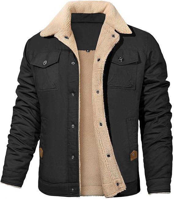 Features a classic lapel collar with a military-inspired trucker style.