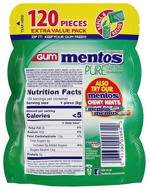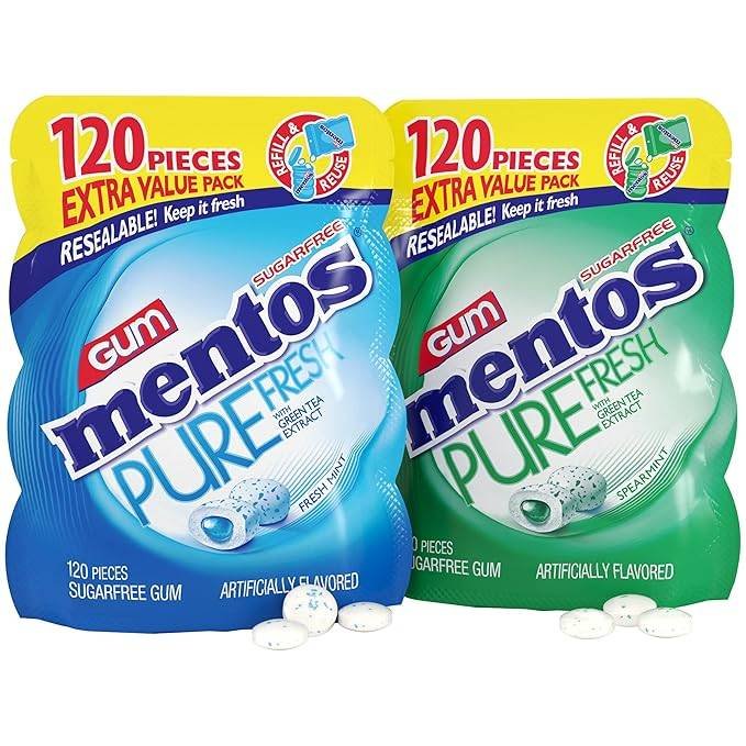 • Bulk resealable bag with 120 pieces of Mentos Pure Fresh sugar-free chewing gum for long-lasting minty freshness.