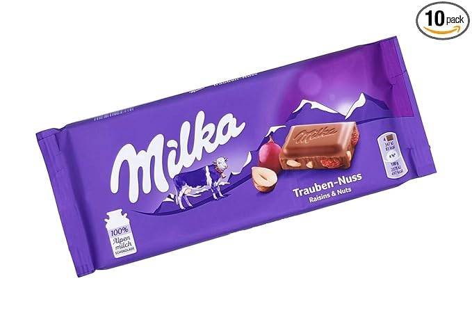 Milka Alpine Milk Chocolate with Raisins and Hazelnuts is a chocolate bar combining milk chocolate with dried raisins and hazelnut pieces.