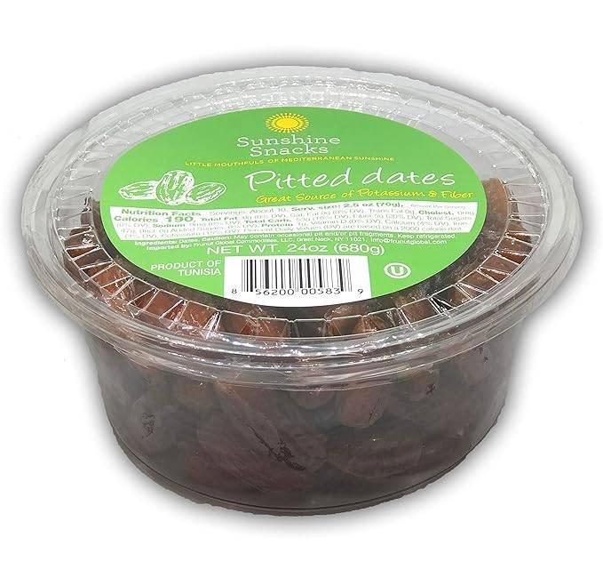 Pitted Date (Premium Quality) by Sunshine Snacks comes in a 24 oz package.