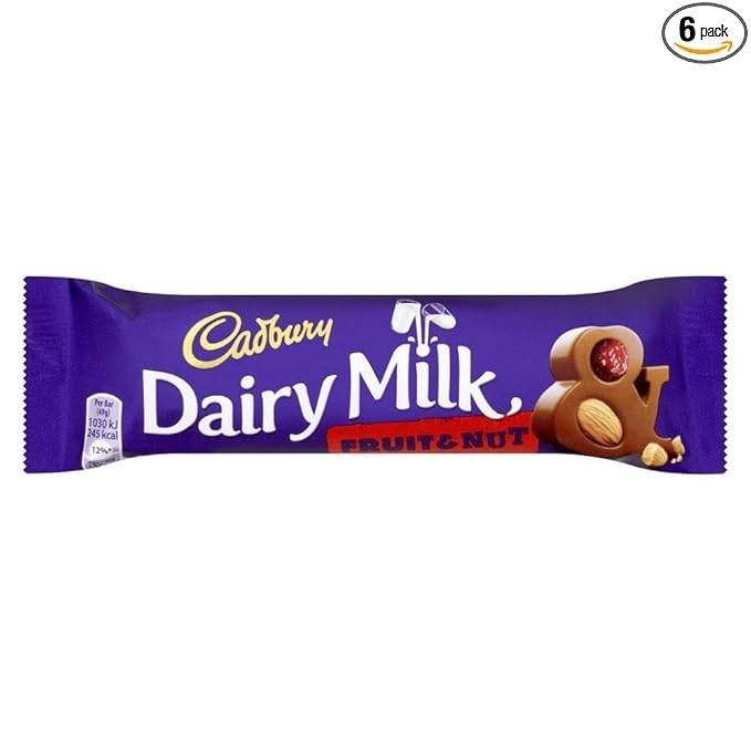 Cadbury Dairy Milk Fruit and Nut Chocolate Bar 49 g is a milk chocolate bar with dried grapes and almonds.