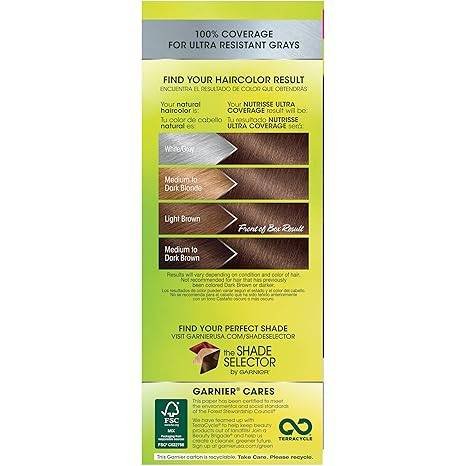 Garnier Nutrisse Ultra Coverage 600 delivers rich, Deep Light Natural Brown color with warm Spiced Hazelnut tones.